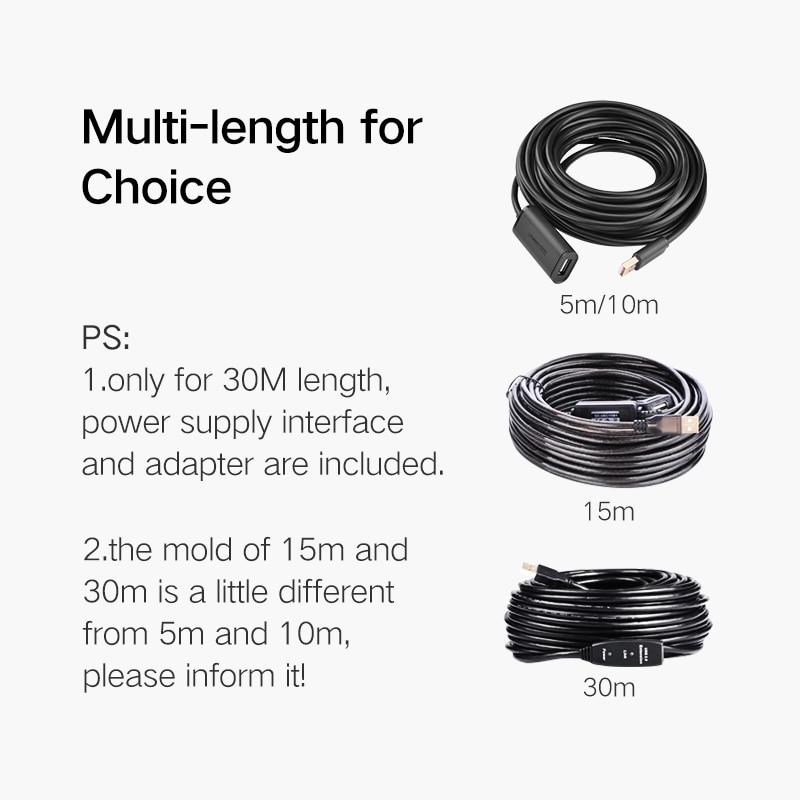 1) USB 2.0 Model: 480Mbps transfer rate, 5m/10m/15m/20m/30m available.Does NOT support connecting to hard disk drives.